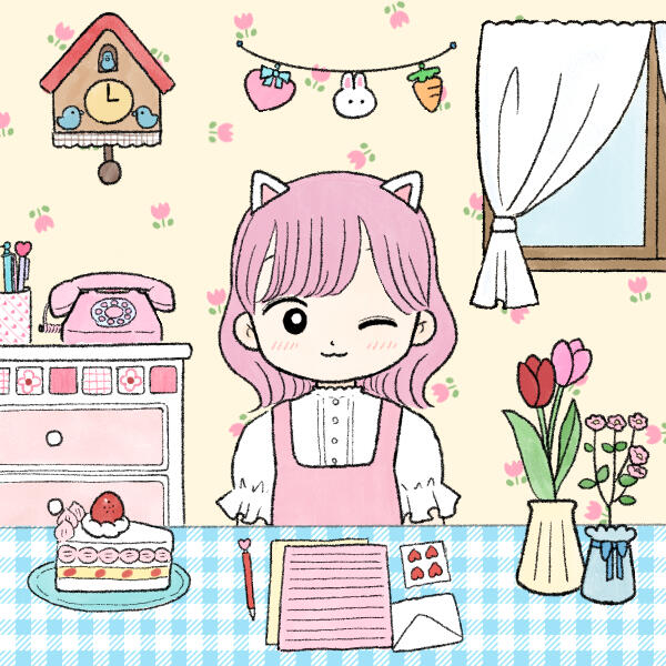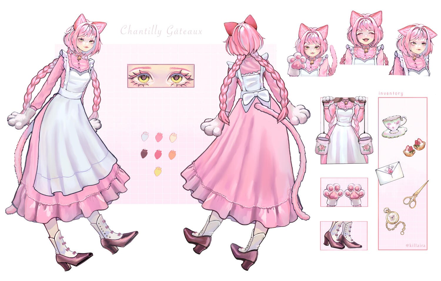 . ⁵ strawberry milk maid > "strawberry milk" theming around strawberry slice cat ears / "milkmaid" barely a pun but it's fun to say. ties back to the chantilly cat = milk theme.